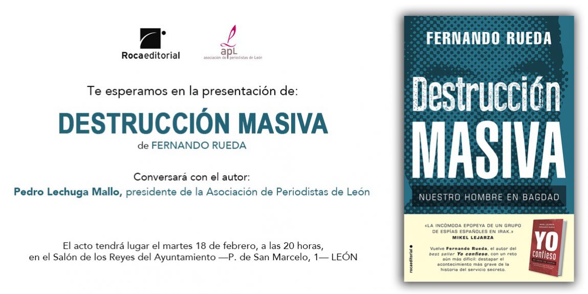 La Asociación de Periodistas de León ha organizado un ‘Encuentro APL’ el próximo martes 18 de febrero en el que se presentará el último libro del periodista y escritor Fernando Rueda «Destrucción masiva». Dicho acto tendrá lugar en el salón de los Reyes del Ayuntamiento de León a las 20:00 horas, siendo la entrada libre hasta completar aforo. Durante dicha presentación el autor también hablará sobre su anterior libro «Yo confieso», del que recientemente ha llegado a las librerías la séptima edición.